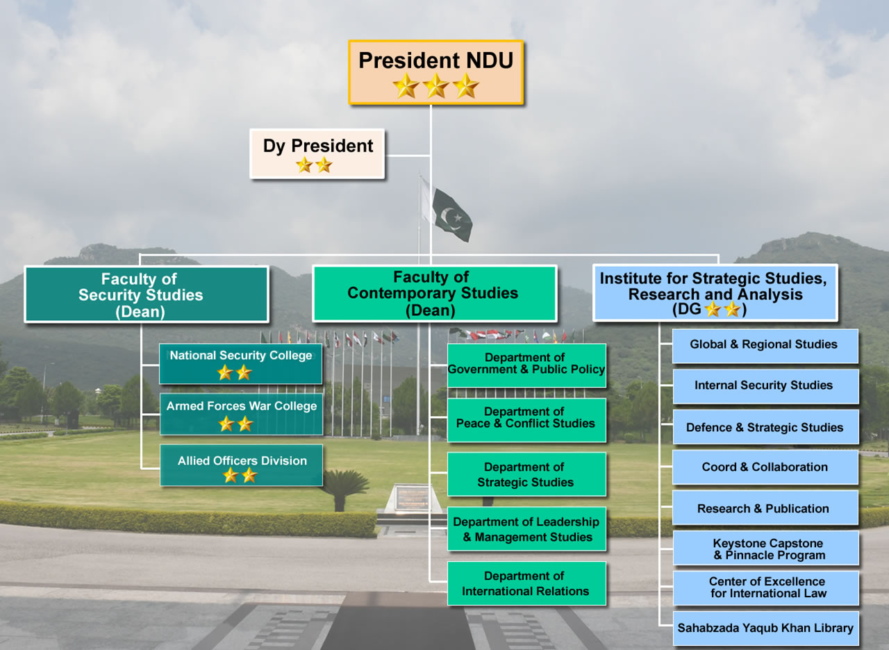 In 1971, Army War Course was re-designated as ‘Armed Forces War Course’ and the strength of the course was raised to 20, including three officers each from Navy and Air Force. In 1975, on the directions of the then Prime Minister Mr Zulfiqar Ali Bhutto, the College was affiliated with Federal University of Islamabad (now Quaid-i-Azam University), for the award of Degrees of MSc (War Studies) to the participants of Armed Forces War Course. Owing to scarcity of space for expansion of the College in Lalkurti, the then President, General Muhammad Zia Ul Haq, took the decision in February 1980 to shift the College to Islamabad. The College was accordingly shifted to newly constructed building in Islamabazd on 14th August 1995.